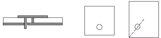 另一種饋線匹配法是將一同軸線的中心導體透過介電質,在適當的阻抗點接觸到補片的底部。補片的中心是經過此結構中的一個過孔(via)接地的,如下方的左圖與中圖所示。